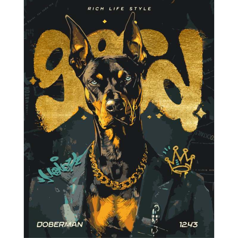 Картина за номерами Доберман із золотим ланцюгом З фарбами металік 40*50 см LW 30460