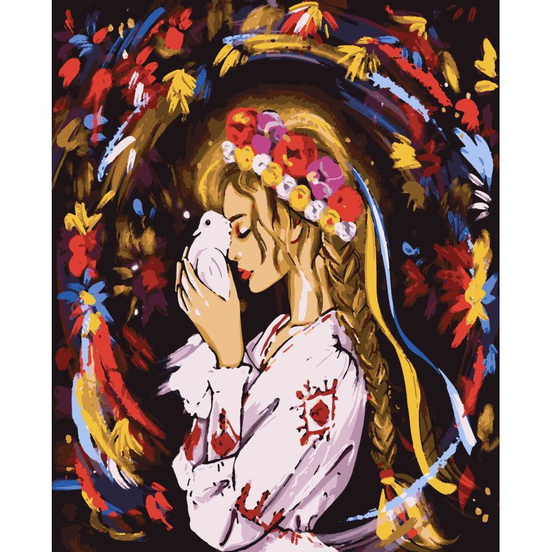 Натуральне полотно на підрамнику із галерейною натяжкою. На картину нанесено схему контурів зображення з нумерацією. - 2 нейлонові художні пензлі - Соковита палітра, пронумерованих, акрилових фарб у контейнерах - Специфікація