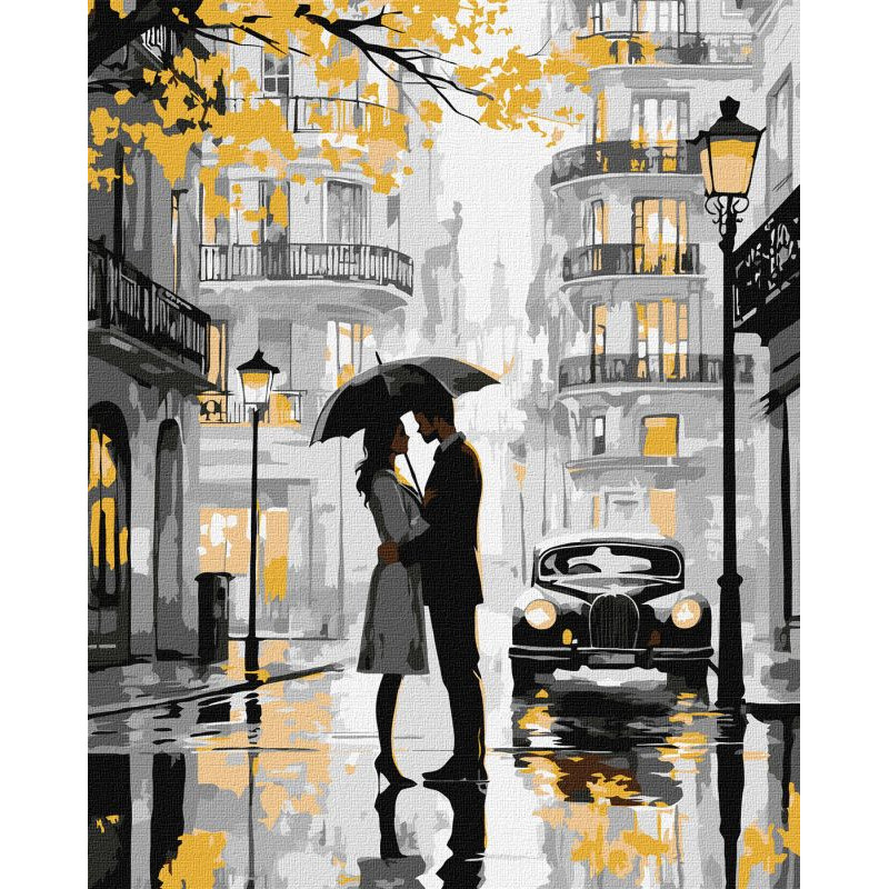Картина за номерами Поцілунок під дощем з фарбами металiк 40х50см КНО8542